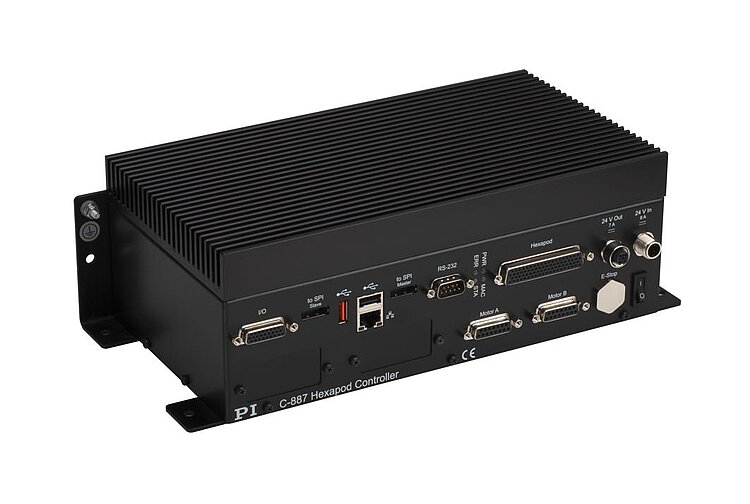 High-performance digital controller for controlling hexapods (6-axis parallel kinematics). Supports various drive types as the controller only provides the control signals, whereas the motor drivers are located in the hexapod or in a separate driver box. In addition, the motor drivers for two further single axes can be controlled.
