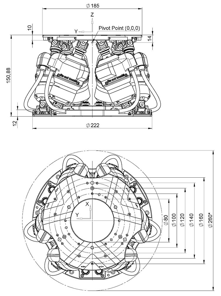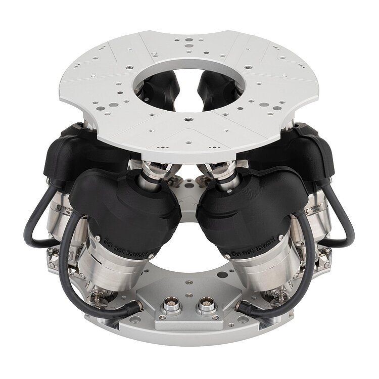 Hexapod for industrial precision applications; BLDC motor; 10 kg payload; 20 mm/s maximum velocity; absolute measuring encoder. Connecting cables are not included in the scope of delivery and must be ordered separately.