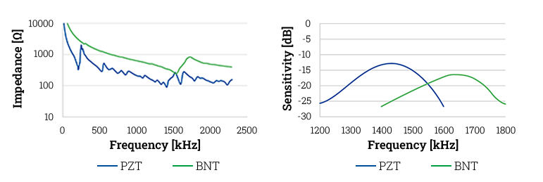 The use of lead-free components only has a minor effect on the air-water sensitivity (lead-free signal vs. PZT-based signal: -3 dB). Adaptation is required primarily to account for differences in impedance and frequency. The resonant frequency can be deliberately tuned via the disc thickness. One advantage of lead-free piezoceramics, as demonstrated here, is that no coupling between radial and thickness modes occurs. This results in higher signal quality, improved measurement accuracy, and a reduction of undesired resonances.