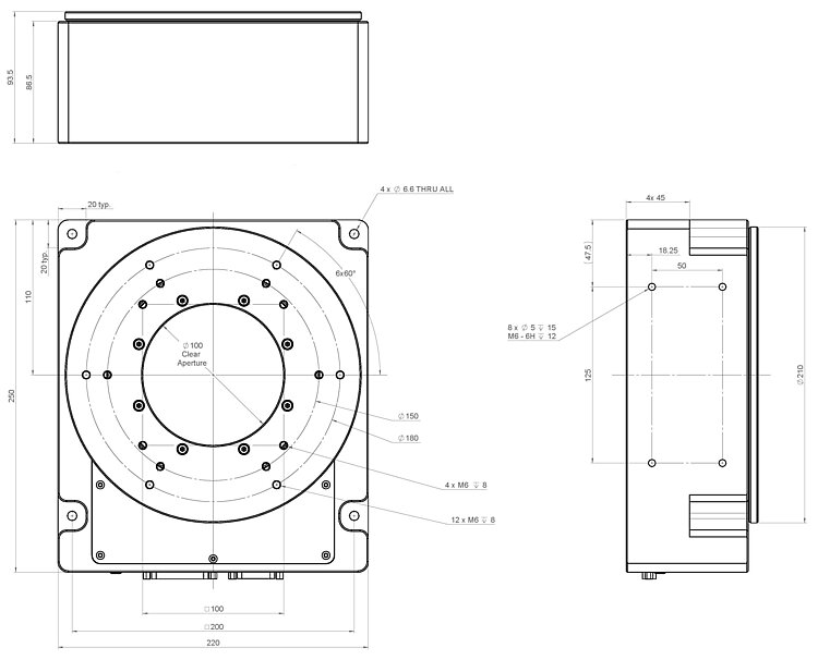 Note on permissible push force and permissible torque: The maximum load capacities are mutually exclusive, e.g., the stage can be loaded with the maximum permissible push force in X / Y with the maximum permissible push force in Z with the maximum permissible torque in θX / θY.