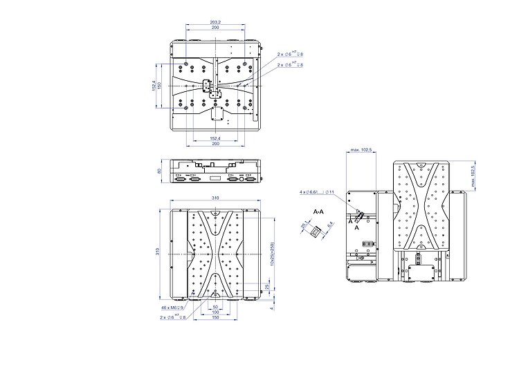Precision XY stage; DC motor; 205 mm × 205 mm travel range (X × Y); 200 N load capacity; 50 mm/s × 50 mm/s maximum velocity; ball screw; incremental linear encoder, 20 µm sensor signal period, sin/cos, 1 V peak-peak
