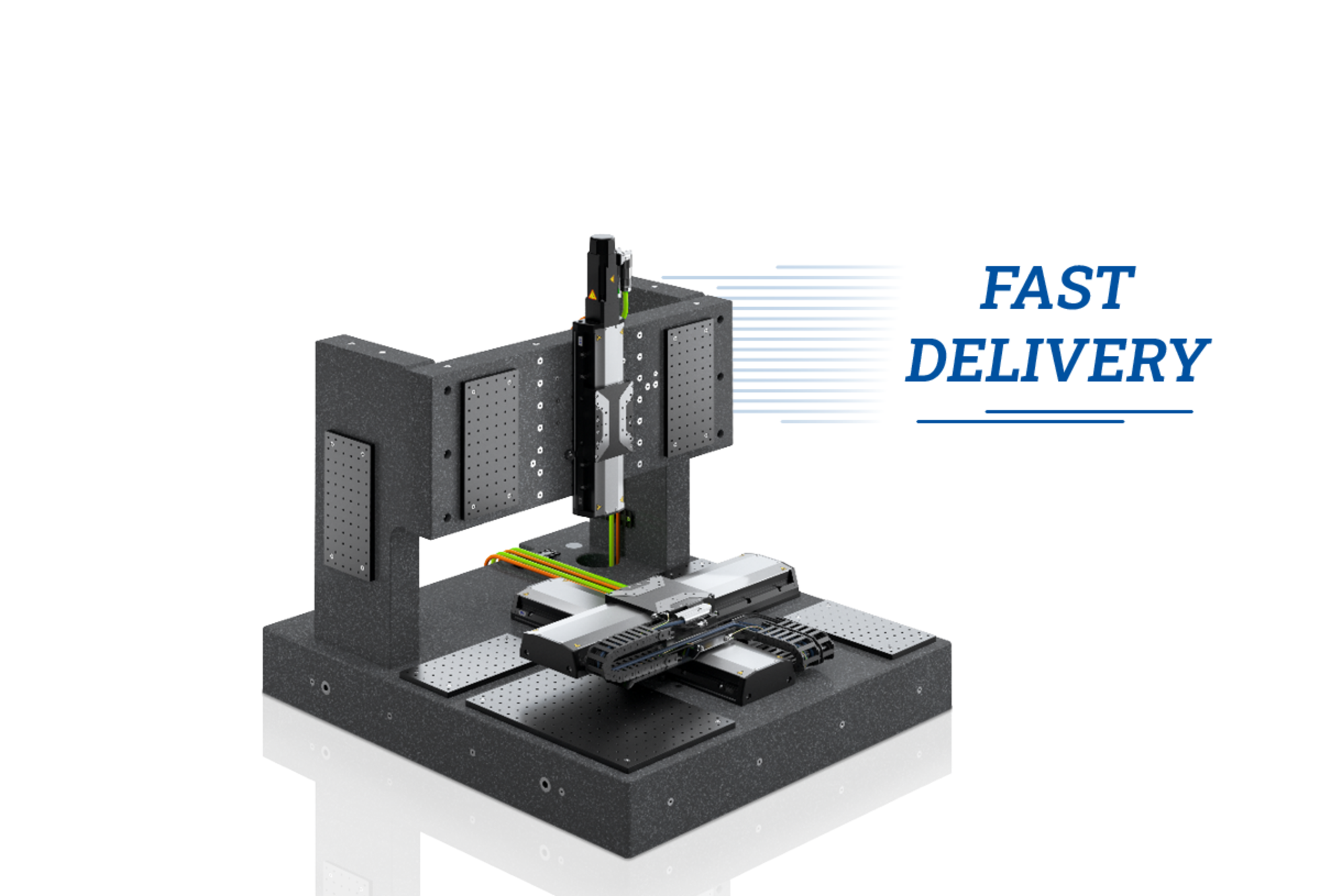 Systems in three performance classes with suitable ACS high-performance controller from PI are available. They are based on an XY system consisting of high-load linear stages, which can be expanded by a Z stage as 3rd axis as well as a Z axis. Base plates made of granite, axis brackets made of aluminum or granite, and additional accessories like a base frame with vibration absorber complement the offer. Your configured system will be delivered with suitable cables and an appropriate cable management.